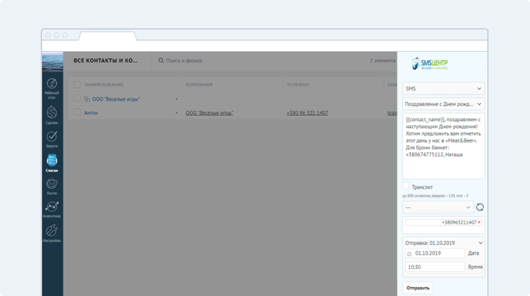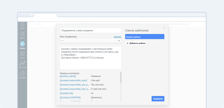 7. В третьем поле напишите текст сообщения для рассылки.Он может быть стандартным — все клиенты получат один и тот же текст или персонализированным — с именами клиентов, должностями и суммами сделок.