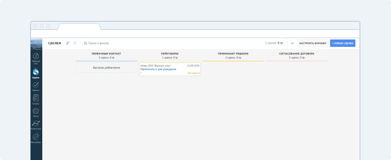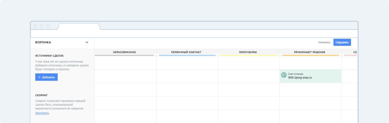 2. Появилась воронка продаж. Представьте, что вам нужно отправить SMS всем, кто оплачивает счёт и находиться в разделе «Принимают решение».